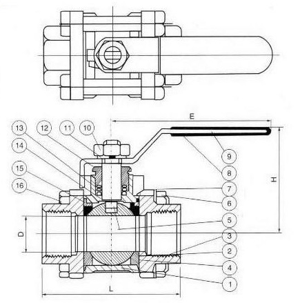 Q11F-16P不銹鋼三片式球閥結(jié)構(gòu)圖